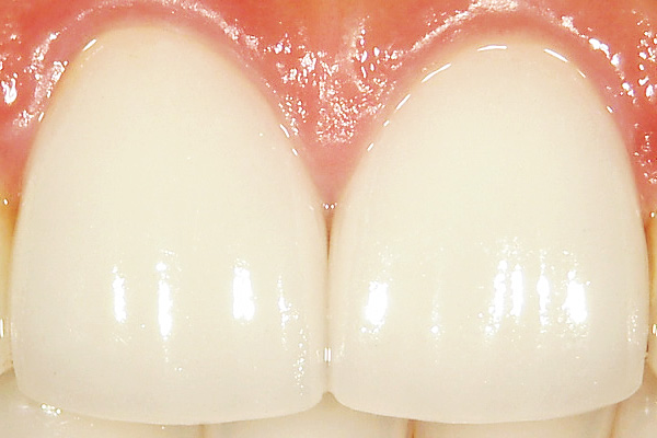 セラミッククラウンと金属を一切しない土台に入れ替えることで歯茎の黒ずみ・差し歯の厚みが解消され、ナチュラルな白い前歯に仕上がりました。