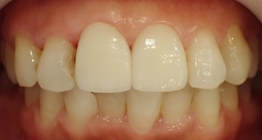 犬歯(3番目の歯)も大きく外側に傾いている場合、前歯6本にセラミックをセットすることで自然に仕上がります。こちらのケースでは、歯肉ラインの調整を前歯2本に行っていますが、前歯4本に行うケースも多くいらっしゃいます。